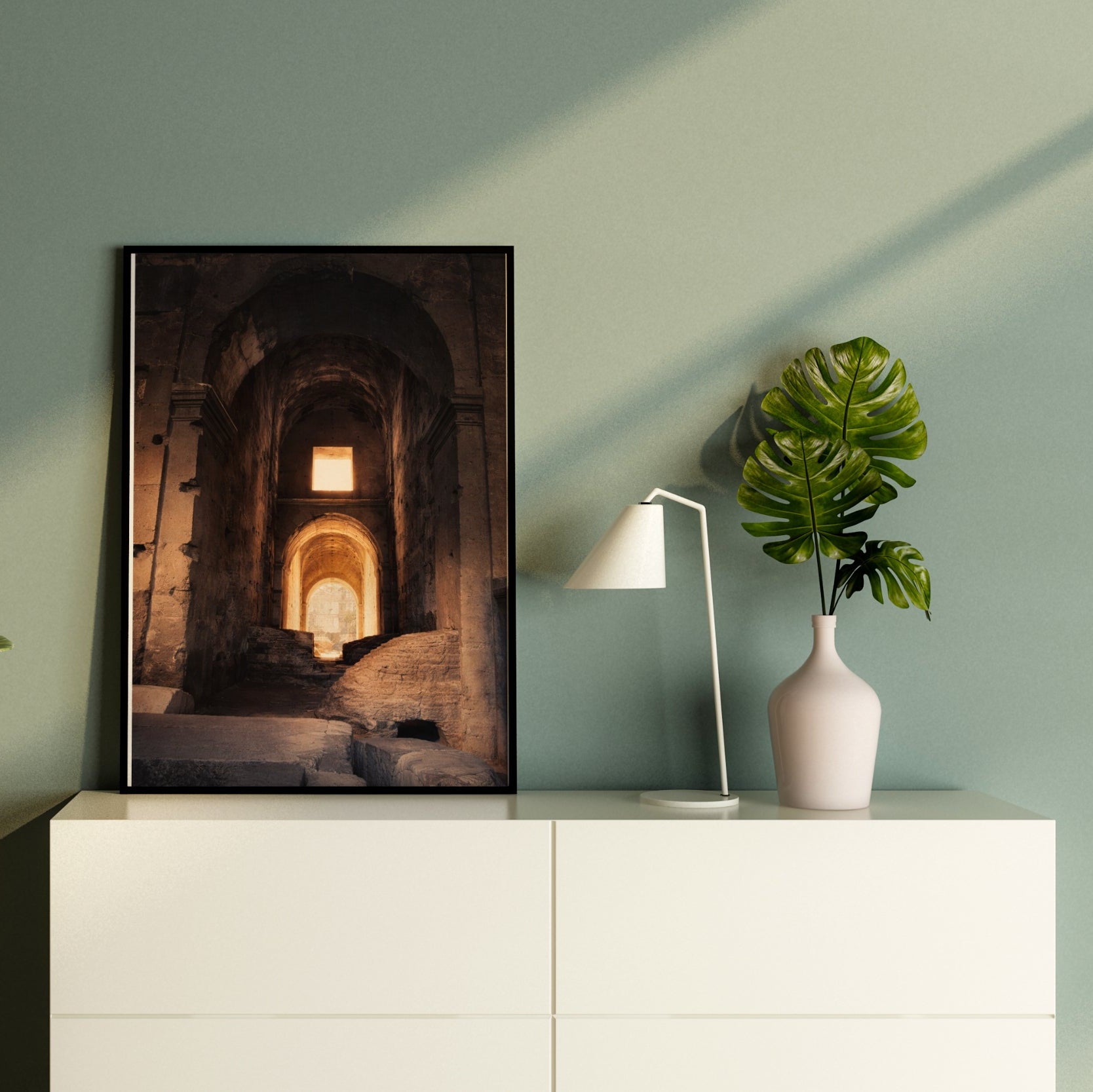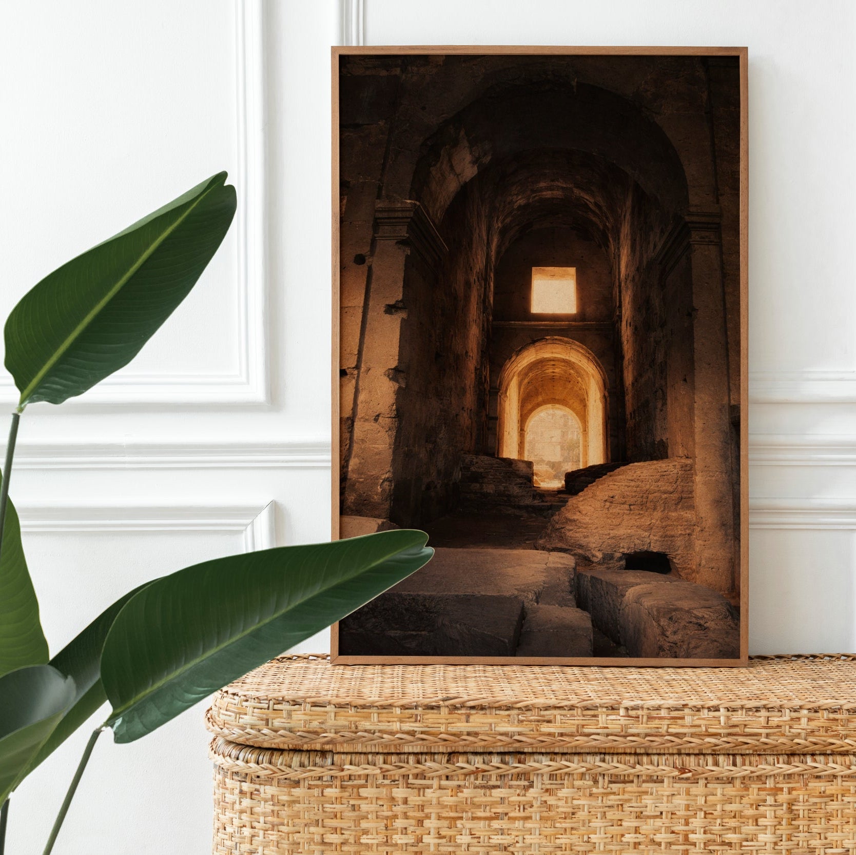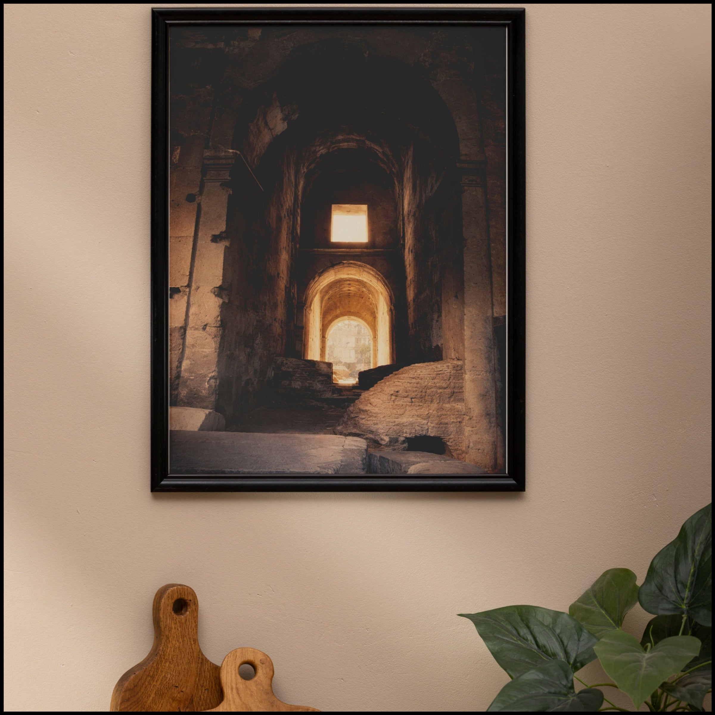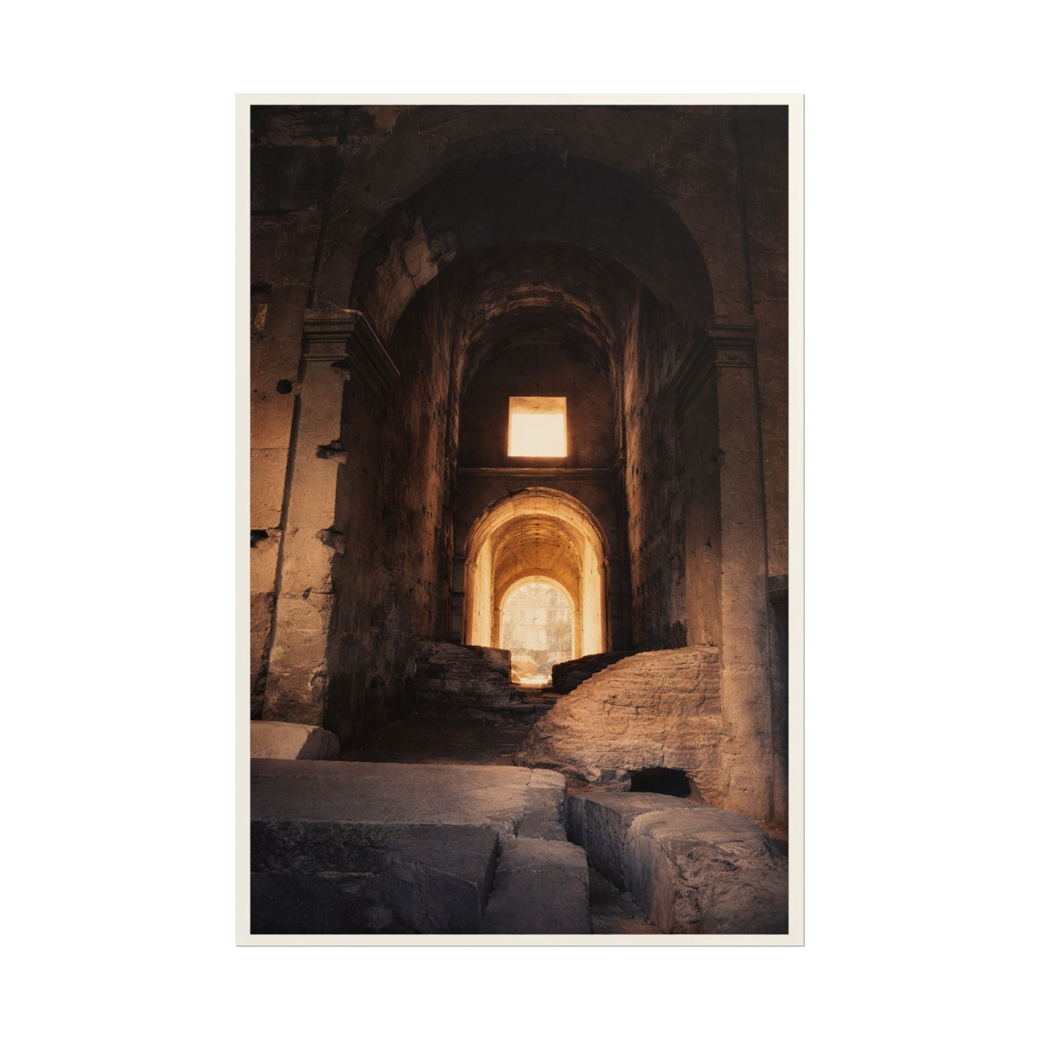 A poster that pulls you into a quiet, sunlit ruin — warm ochres and deep shadows invite slow exploration. The image feels like a small discovery: an arched corridor where light finds the stone in a single, honest beam. Hung in a study, hallway, or creative nook, this print brings a contemplative pause to a busy day. Choose textured fine art paper to emphasize brush-like grain and archival weight, or pick semi-glossy for crisp color and a gentle sheen. Vertical and horizontal sizes let you place it beside bookshelves or above a console, and the rolled format makes it easy to frame or clip-and-hang right away.
